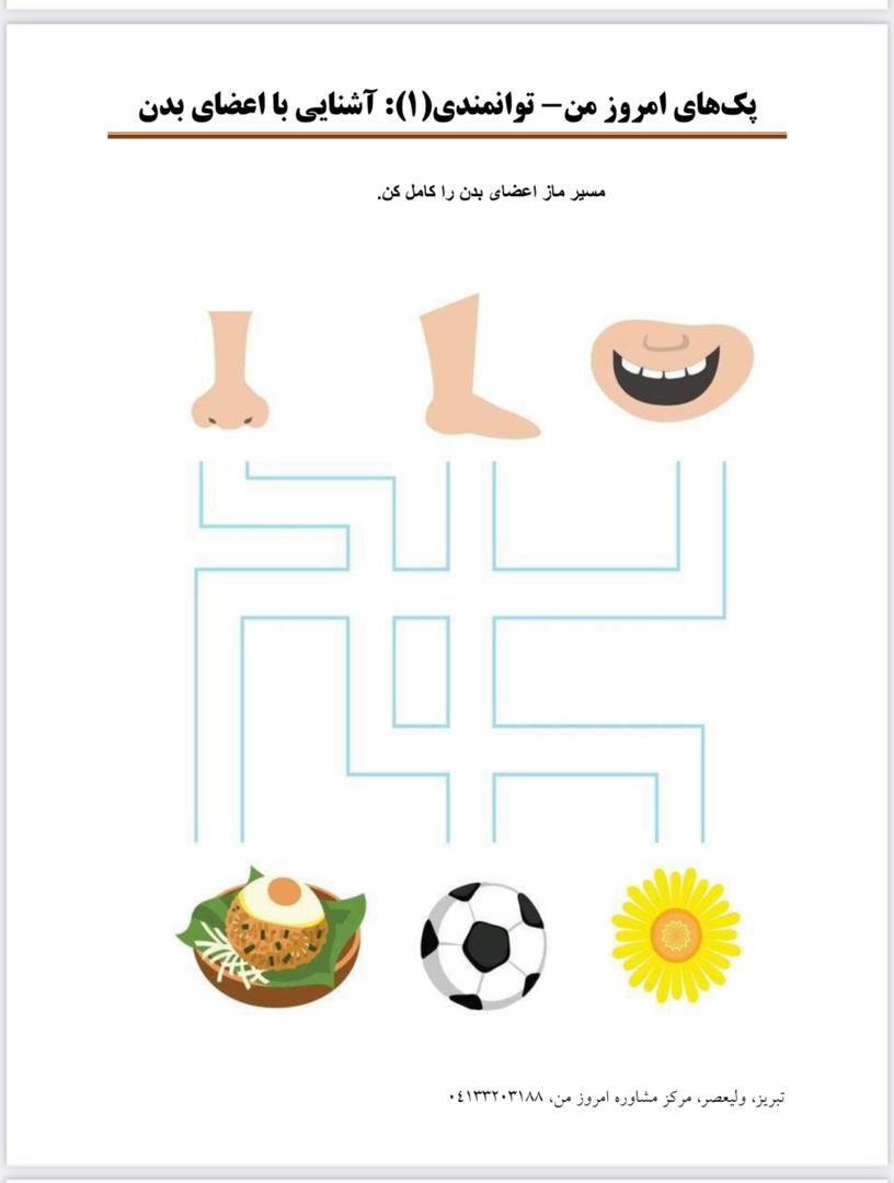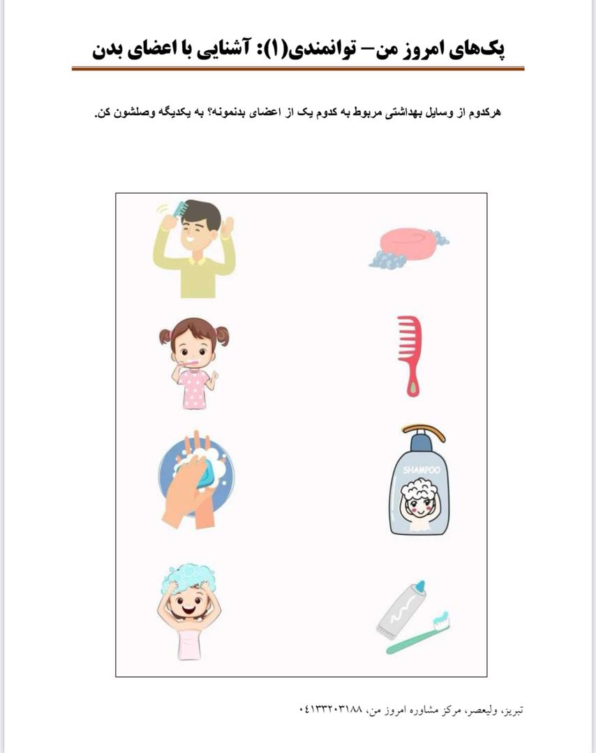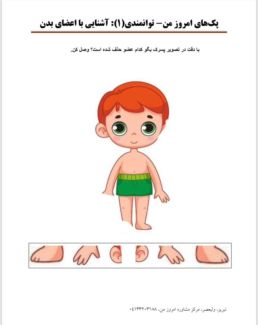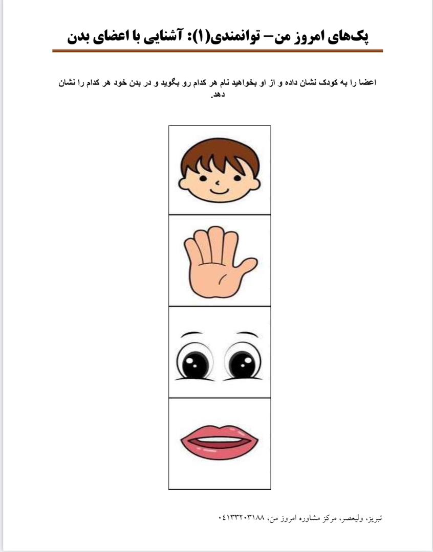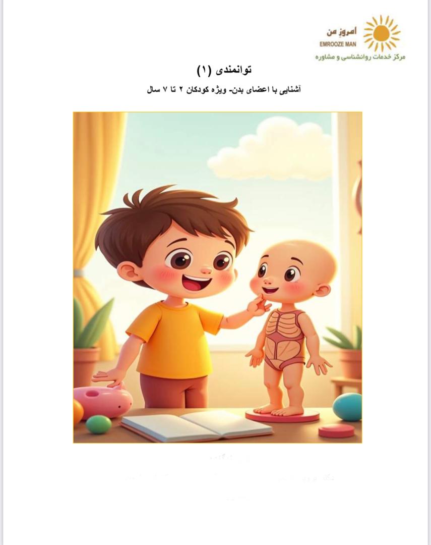 پک توانمندی (1) درباره اعضای بدن، نامگذاری، کاربرد اعضای بدن همراه با سوالات ارزیابی نهایی است، تمام کودکان 2-5 سال انتظار می رود با اعضای بدن و توضیحات هر کدام آشنا باشند و بتوانند نسبت به بدن خود آگاهی کافی داشته باشند.