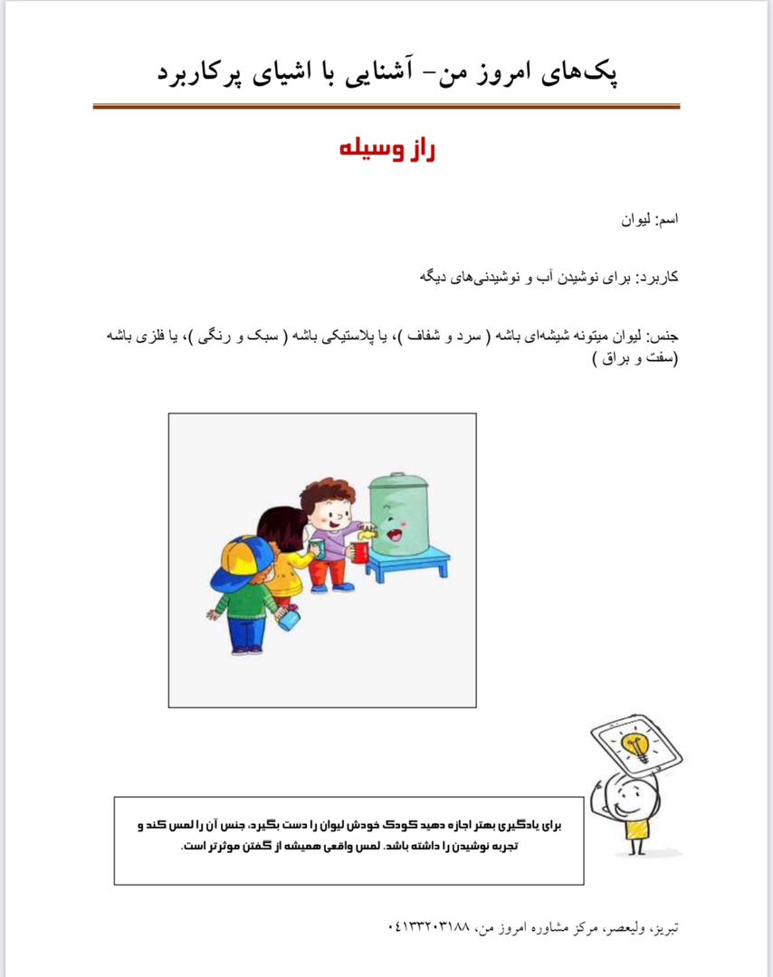 پک توانمندی (5) ویژه کودکان 2 تا 7 سال است و کودکان با نام اشیاء، کاربرد، جنس و تفاوت آن با سایر اشیاء آشنا می شوند که می توان متناسب با درک کودک هر یک از اینها را آموزش داد.